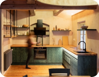 Náš dům pojme ideálně 13 osob (nebo 3 rodiny), jsou zde ale i možnosti navýšení této kapacity. V domě jsou 3 ložnice, každá s vlastní koupelnou a toaletou. Společná obývací místnost s kuchyní, jídelnou a krbem. Ve vrchní části domu se nachází další společenská místnost, která může posloužit k různým aktivitám, ať už jako herna pro děti, anebo prostor pro navýšení ubytovací kapacity. K domu náleží i další soukromé apartmá, s ložnicí, koupelnou, kuchyní a obývacím pokojem s terasou, které může pohostit další 4 hosty (nebo 1 rodinu). Stodola je zde také připravena, aby pojmula všechen dobrý lid – na oslavy, svatby a další radostná setkání. U domu je také zázemí pro obytná auta a stany. Rozlehlý pozemek navazující na louku nabízí další možnosti využití a neomezené parkování.