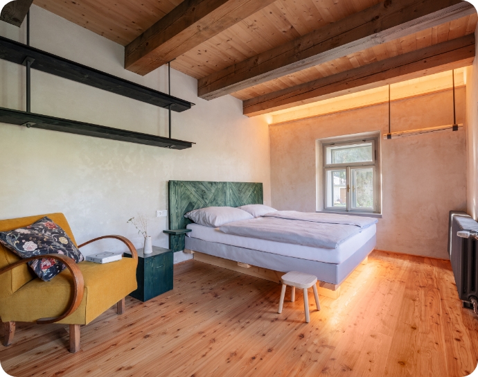 Náš dům pojme ideálně 13 osob (nebo 3 rodiny), jsou zde ale i možnosti navýšení této kapacity. V domě jsou 3 ložnice, každá s vlastní koupelnou a toaletou. Společná obývací místnost s kuchyní, jídelnou a krbem. Ve vrchní části domu se nachází další společenská místnost, která může posloužit k různým aktivitám, ať už jako herna pro děti, anebo prostor pro navýšení ubytovací kapacity. K domu náleží i další soukromé apartmá, s ložnicí, koupelnou, kuchyní a obývacím pokojem s terasou, které může pohostit další 4 hosty (nebo 1 rodinu). Stodola je zde také připravena, aby pojmula všechen dobrý lid – na oslavy, svatby a další radostná setkání. U domu je také zázemí pro obytná auta a stany. Rozlehlý pozemek navazující na louku nabízí další možnosti využití a neomezené parkování.